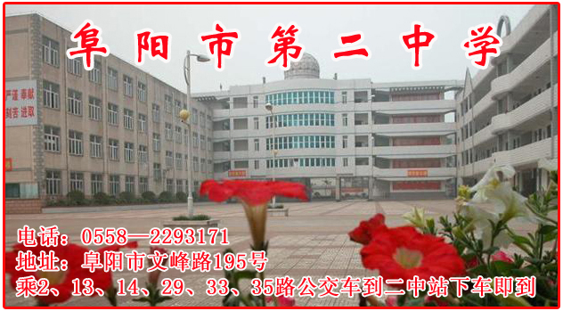 阜阳二中位于颍河之滨,毗邻美丽的外滩公园,环境优雅,风景宜人,是省级“花园式学校”。学校始建于1952年,2002年被评为安徽省省级示范高中。多年来,二中师生凭借智慧和汗水,攻坚克难,励精图治,多次创造了低分进校,高分考取清华、科大等名校的教育奇迹,为国家培养了一批又一批合格人才。